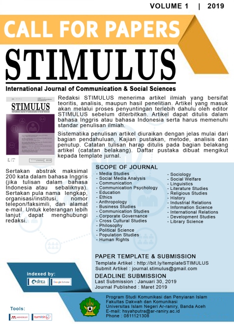 The study focus of Stimulus: International Journal of Communication and Social Sciences are (but not limited to): ▌Media Studies ▌Social Media Analysis ▌Communication ▌Communication Psychology ▌Education ▌Ethics ▌Anthropology ▌Business Studies ▌Communication Studies ▌Corporate Governance ▌Cross Cultural Studies ▌Philosophy ▌Political Science ▌Population Studies ▌Human Rights ▌Sociology ▌Social Welfare ▌Linguistics ▌Literature Studies ▌Religious Studies ▌History ▌Industrial Relations ▌Information Science ▌International Relations ▌Development Studies ▌Library Science Every received article should follow Author guideline. Any submitted paper will be reviewed by reviewers. Review process employs Double-blind Review that the reviewer does not know the identity of the author, and the author does not know the identity of the reviewers. Stimulus: International Journal of Communication and Social Sciences has become a CrossRef Member since the year 2019. Therefore, all articles published by IStimulus: International Journal of Communication and Social Science will have unique DOI number.